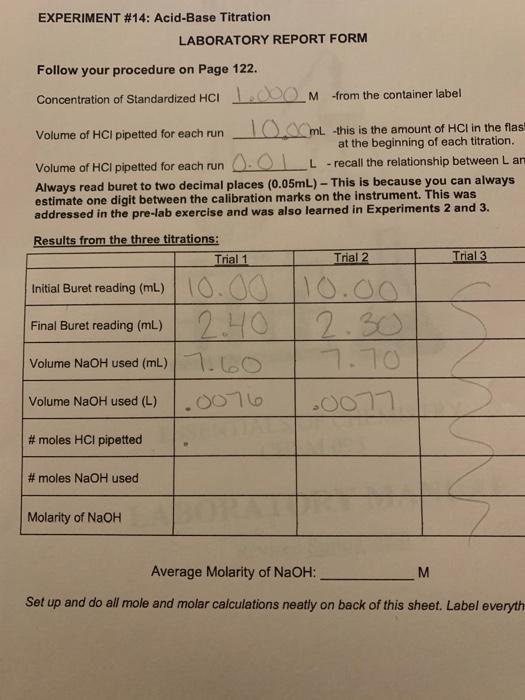 Solved Experiment 14 Acid Base Titration Laboratory Report Chegg Com